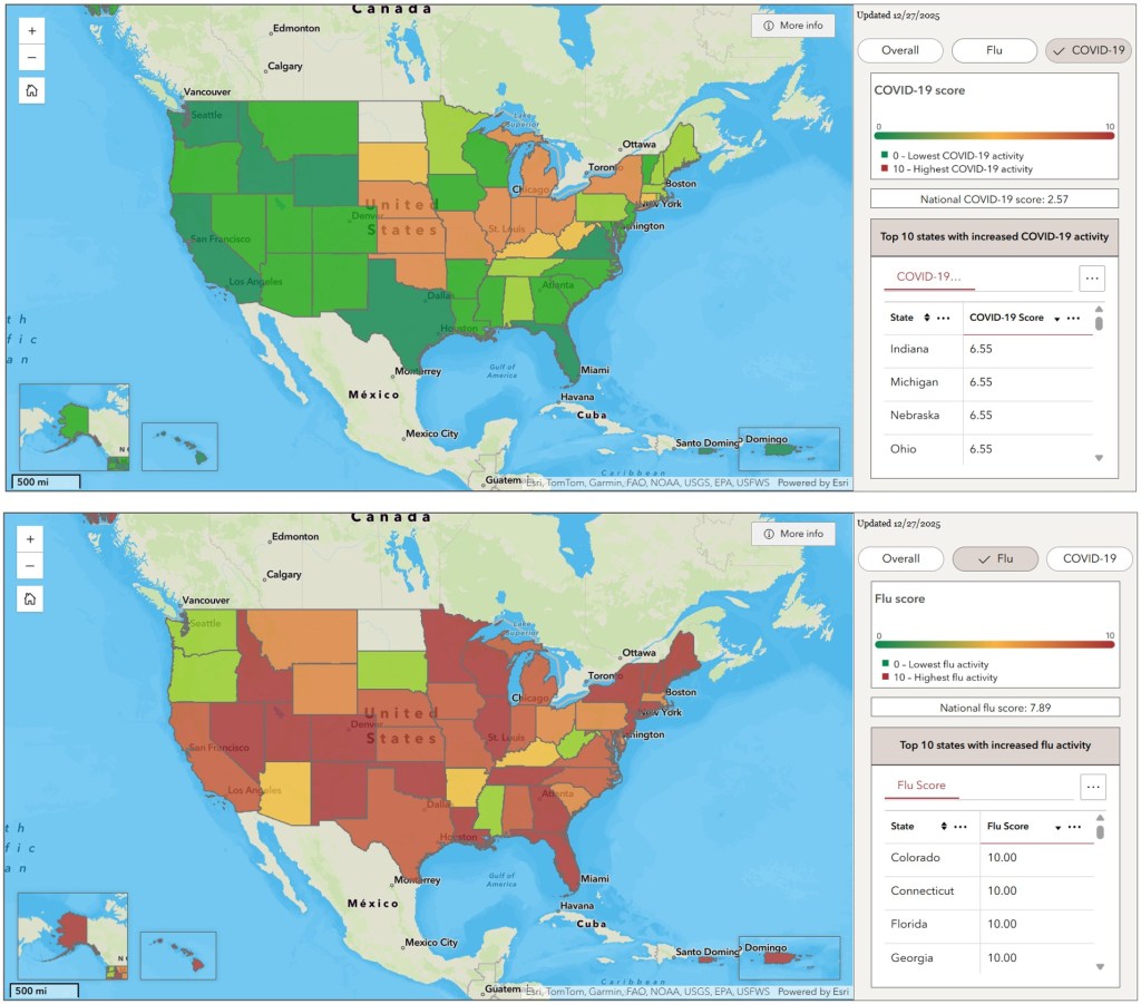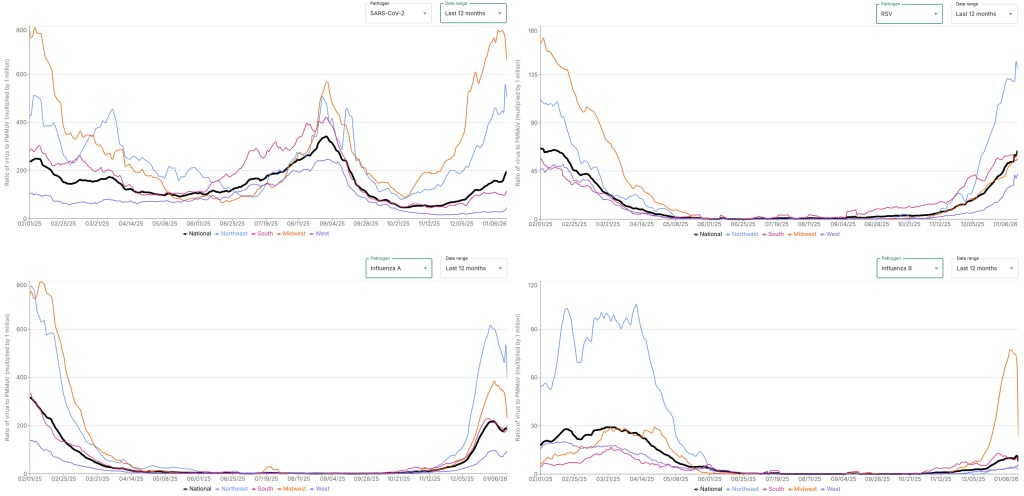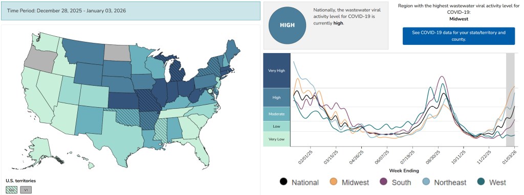 Jan. 12, 2026: Flu levels are still very high across the country, but have started to decline. COVID levels have increased dramatically, especially in the Midwest. RSV levels continue to rise in much of the West and Midwest, but tend to be staying the same or decreasing in the Northeast and the South. For information on respiratory disease activity in your area, see Force of Infection’s Outbreak Outlook.