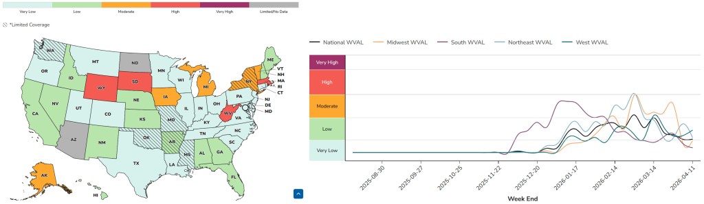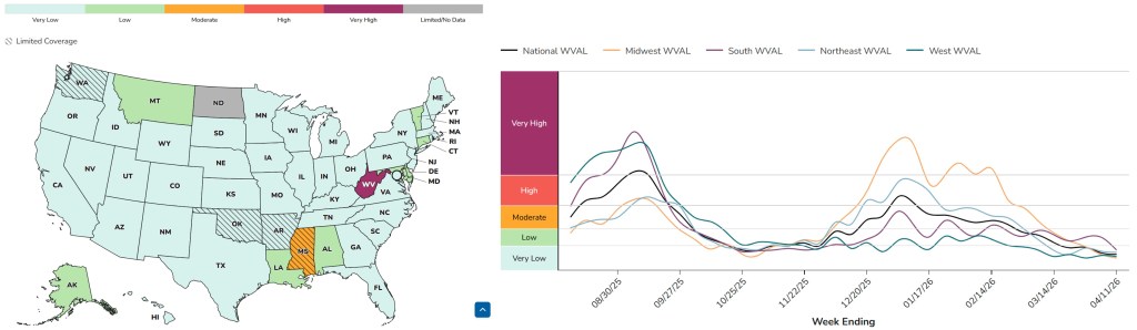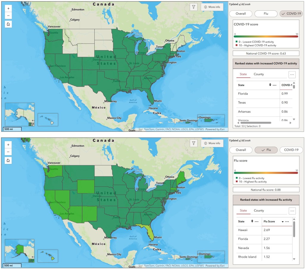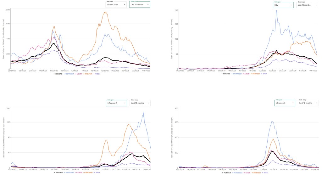 Apr. 21, 2026: Special note! The CDC updated its website last week and now has a single page with info about wastewater data for Flu A, COVID, and RSV. They’ve also updated their all-blue maps to ones with multiple colors – much easier to viscerally understand. The data for the different diseases hides behind three tabs that are easy to miss, so I’m linking to each tab individually below.